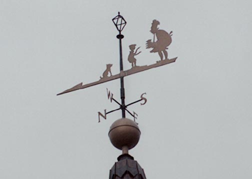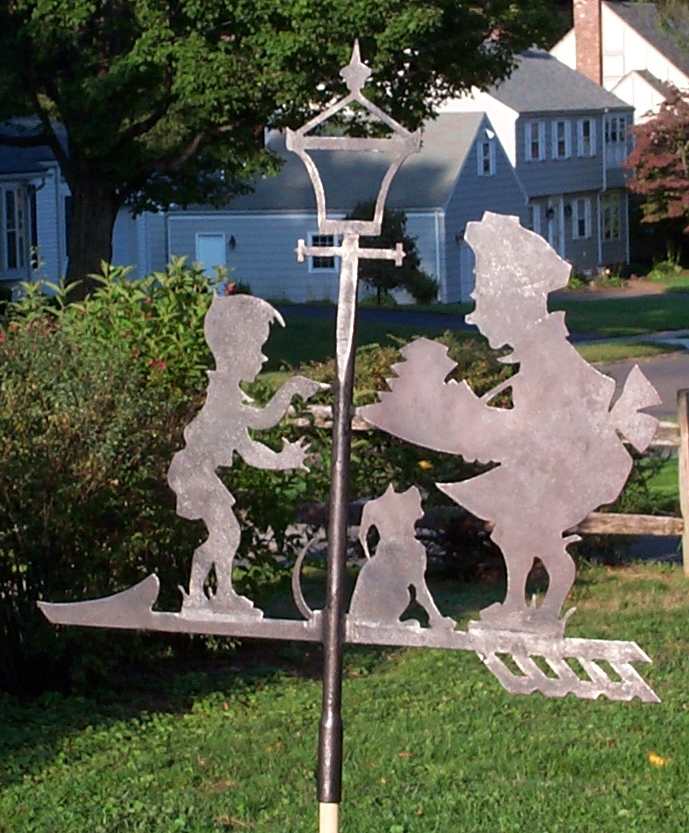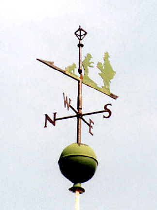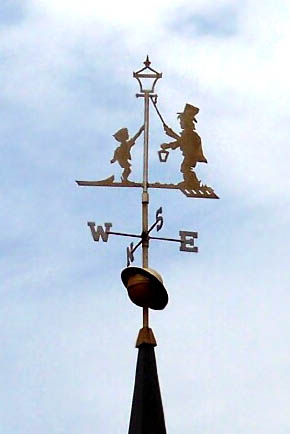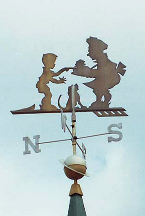 General Un-documented History:I do not know who manufactured the weathervanes as I have never seen any documentation about them, Nor do I know who came up with the three designs, but they were based upon the original John Alcott 1930's logo design. Who cut the patterns and the steel is lost to time. I have been told by a former owner that they were fabricated in-house at Ho-Jo'S Corporate Head-Quarters in Mass. Others say they were custom built by the Landmark Fixture Corporation, which I always thought was just another wholly owned Ho-Jo'S Company, and maybe also located at corp HQ, or at the Brockton Kitchen location. In any event the weathervanes are very simple in their design and construction. The three classic design weathervanes are made from sheet steel, and standard pipe. The shapes are either stamped-out or cut with a torch from sheet metal in the shapes of the arrow point,, and the arrow tail as well as the Simple Simon, the Dog,, and the Pieman characters, the Dogs tail, and Lamp housing at the top including the sign hangers left and right, The lamp Post is a flattened pipe tube at which the lamp housing is welded to the top of the post. the sheet metal items are welded on to the Arrow stem. the arrow stem is sometimes rounded pipe, or flat iron. the Light housing is welded onto a flattened top of the shaft, Spot welds hold Simons finger and the Pieman's goods tray to the post. In the Lamp Lighter Design used on Ho-Jo'S Motel Lodges Gate Houses, Simple Simon's finger and the lamp lighters rod are each spot welded to the Lamp post for added stability. In the Stand-Alone Restaurant design example there is no pole to stabilize the characters so Simons finger is welded to the Pie Man's tray by a bent strip of sheet metal. The Stand Alone Restaurant design had different patterned Simple Simon'S, his Dog, and Pie man then the Lodge Restaurants did. It's amazing how much detail was put into the units even with the Simple constructions methods employed. Never the less these guys are durable, as evident by the fact that the weathervanes in some locations have lived almost 20 years longer then the restaurants they watched over, And all this without any maintenance. All 3 styles shared common mounting elements. The six foot tall thin cupola was capped with a square copper plug. The 10 foot mounting rod that was affixed to the roof below protruded through the cap and allowed the Saturn,, cardinals and vane to be mounted. Original Design Examples below are still flying on former locations on former colonial design buildings